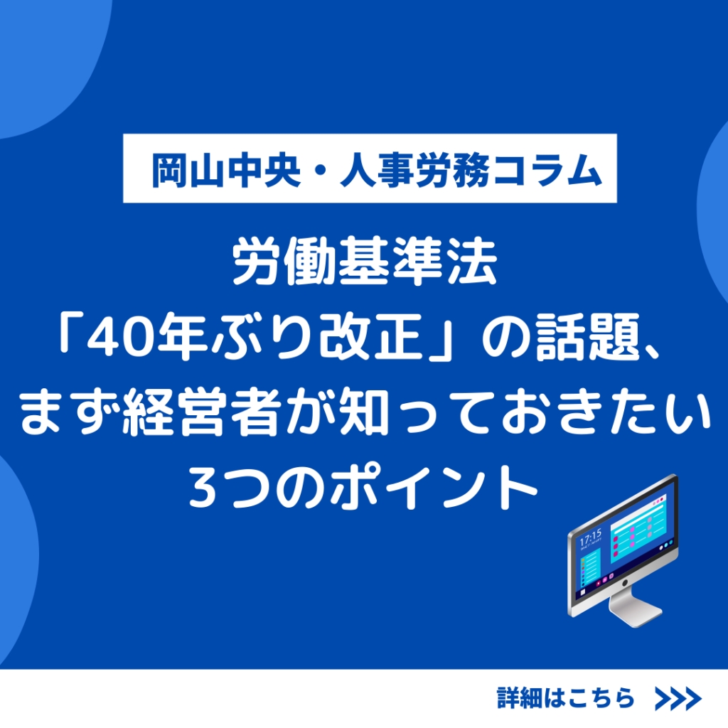 【人事労務コラム】労働基準法「40年ぶり改正」の話題、まず経営者が知っておきたい3つのポイント|社労士 岡山・倉敷