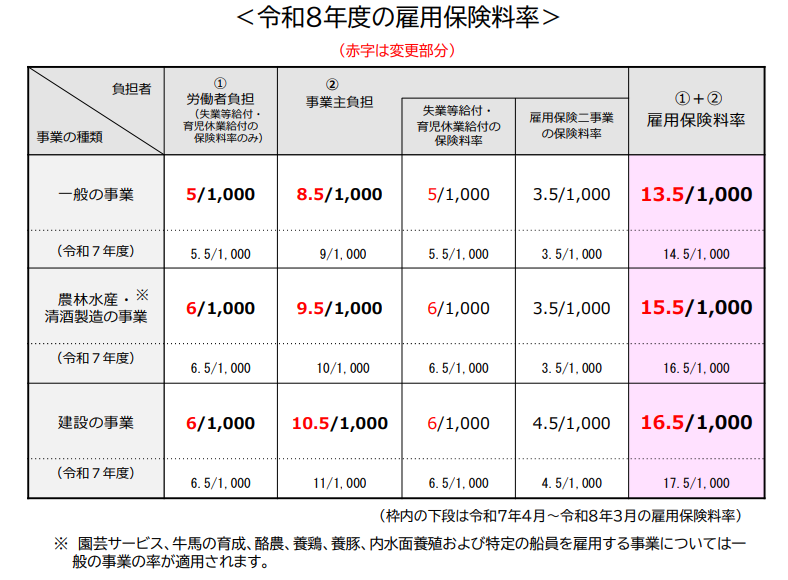 詳細は厚生労働省の「令和8年度(2026)年度 雇用保険料率のご案内」をご確認ください。