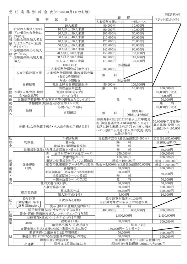 当社の料金表は下記になります。